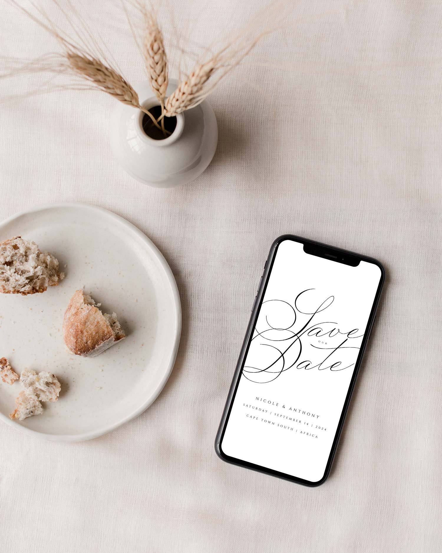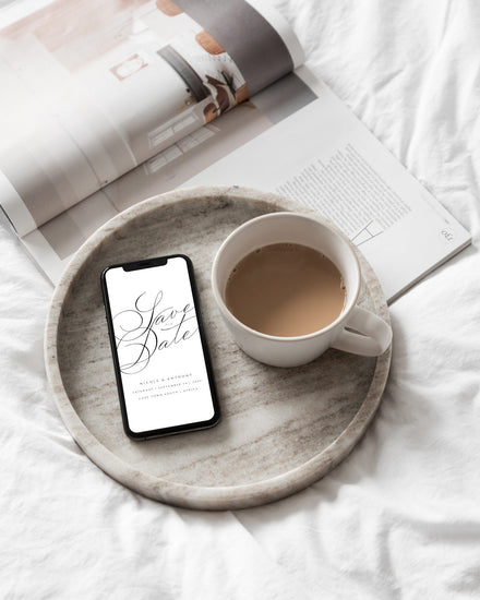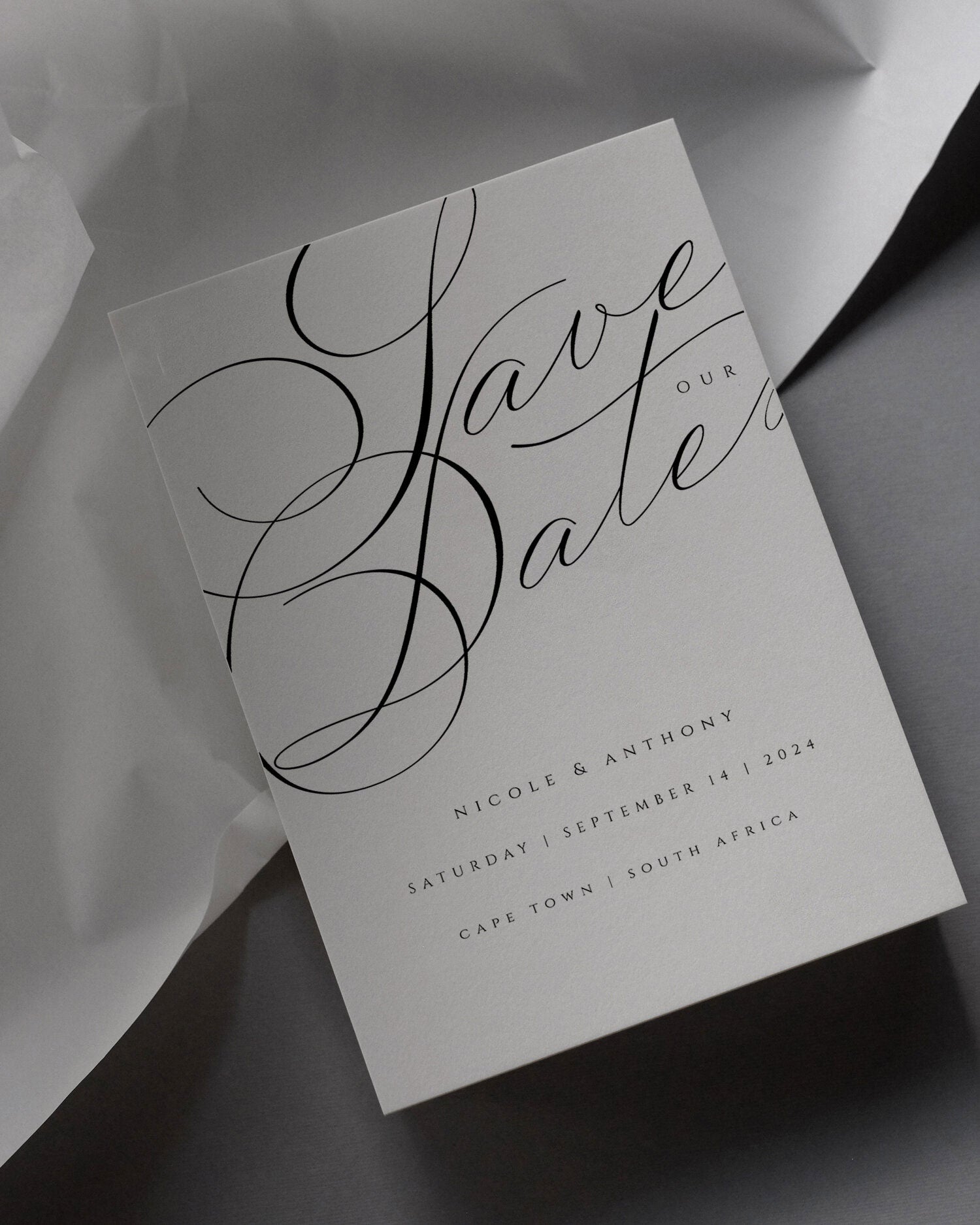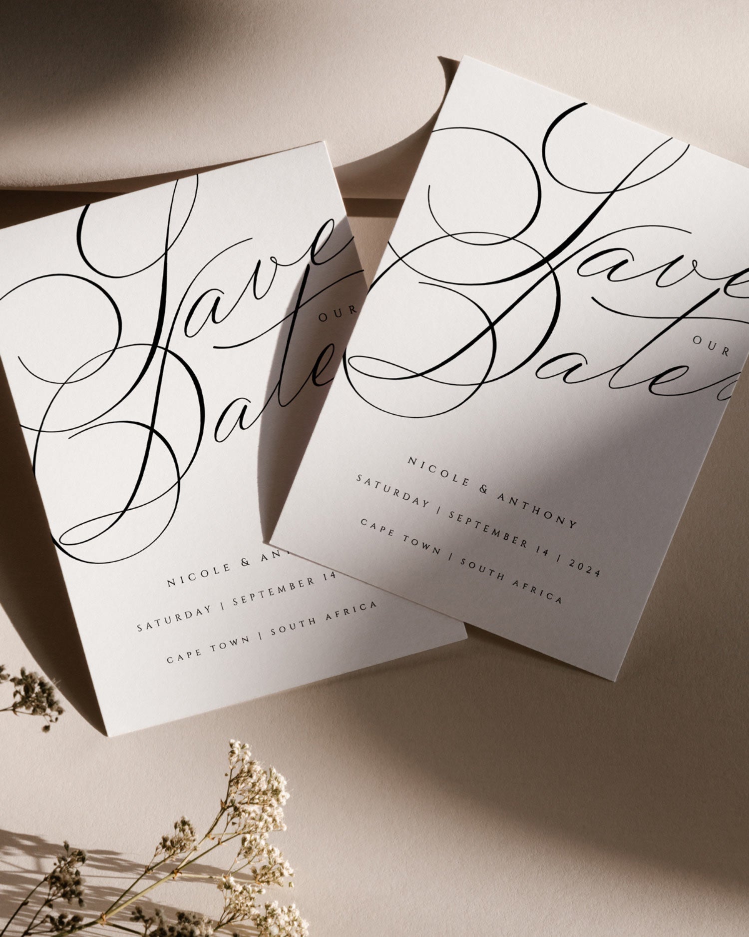 The Lile Wedding Save The Date Template embraces intricate filigree elements and classic calligraphy. Combining and adapting classic calligraphy and a filigree monogram, it's inspired by the modern-day bride.