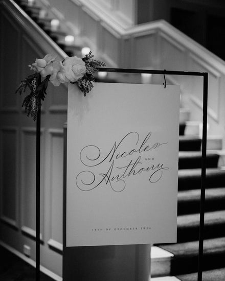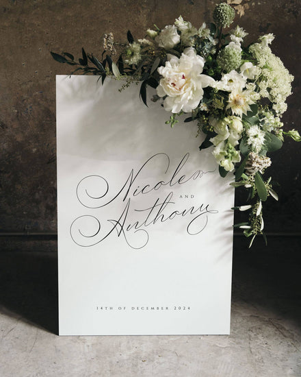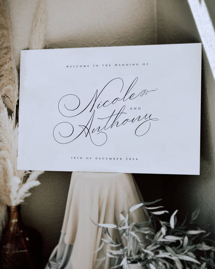 The Lile Wedding Welcome Sign Template Set embraces soft curves and calligraphy typography. Featuring a romanticized monogram and delicate typography, it’s inspired by the classic bride.