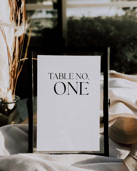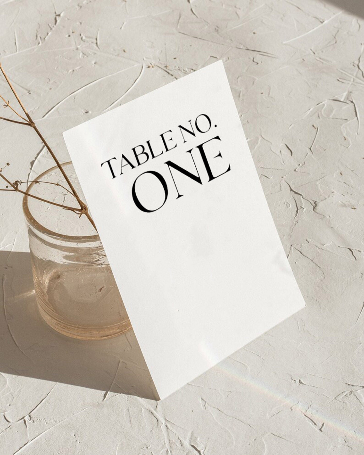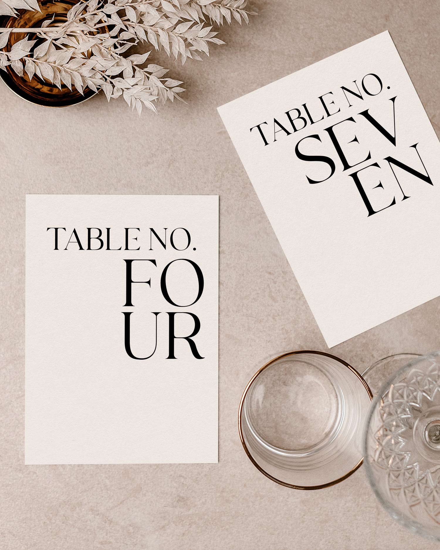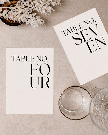 The Maeve Seating Table Numbers Template set embraces modern typography and minimalist design. Featuring a bold monogram and stylized font, it’s inspired by the modern and luxe bride.